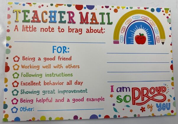 One small tool that makes a big difference is Teacher Mail. Teacher Mail is a little postcard I fill out and send home. It has quick checkboxes like “worked well with others,” “showing great improvement” and “excellent behavior,” and then it has a blank line where I can write something specific. I sign it and hand it to the student to take home and stick on the fridge.